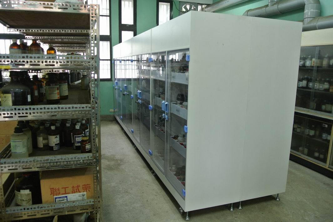 櫃體:厚度18mm,PVC硬殼發泡板製 藥品盛盤:南亞PVC工業用硬質塑膠板製。 耐強酸鹼、耐化學藥品、耐衝擊、耐潮濕、不變形、不腐蝕、不生銹。 內部具藥瓶防震傾倒功能、調整高度功能、盛盤可拉式