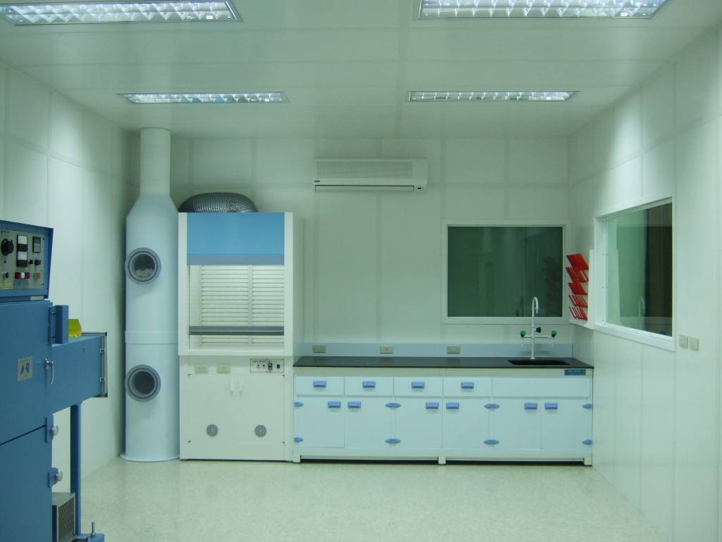 此實驗室設計規劃中,在教室內搭建全PVC材質的實驗工作空間,內外部設置廢氣處理型排氣櫃及PP實驗邊桌。