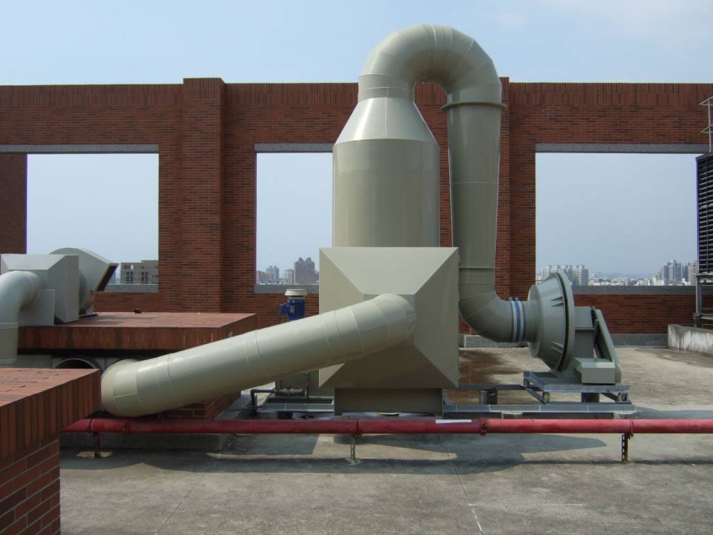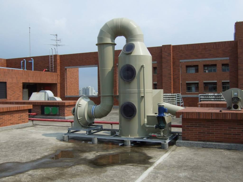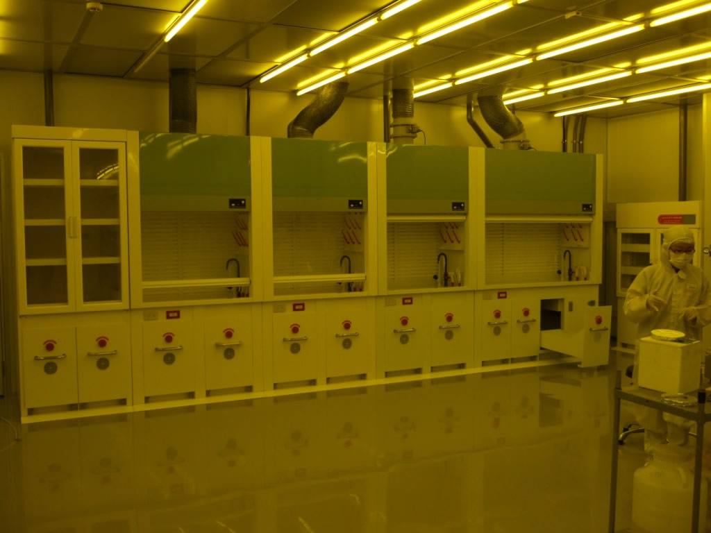 洗滌塔連接設備:排氣櫃 5 台、藥品櫃 3 台、廢液暫存櫃 5 台、玻璃器皿晾乾箱 1 台、銜接無塵室內部精密儀器抽氣支管約25支
